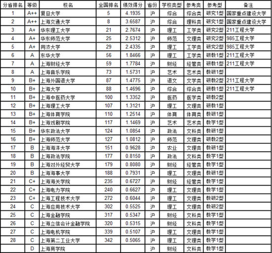 教师绩效是大学各项办学指标中最重要的指标之一。2017年,在这项指标的竞争中,有15所大学获得A++级的最高等级。中国科学技术大学以5.5058分获第1名,浙江大学以4.5618分得第2名,南京大学以4.5386分列第3名。获得第4名至第15名的大学依次是:第4名北京大学,第5名复旦大学,第6名清华大学,第7名北京师范大学,第8名上海交通大学,第9名南开大学,第10名中国人民大学,第11名北京化工大学,第12名东南大学,第13名中国农业大学,第14名北京航空航天大学,第15名天津大学。 2017上海市大学教师效率排行榜如下: